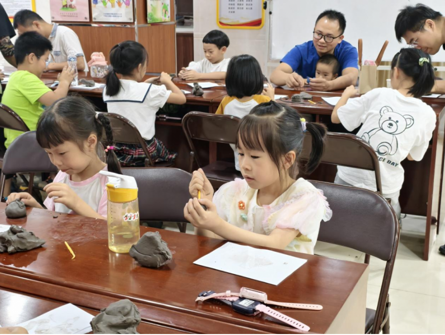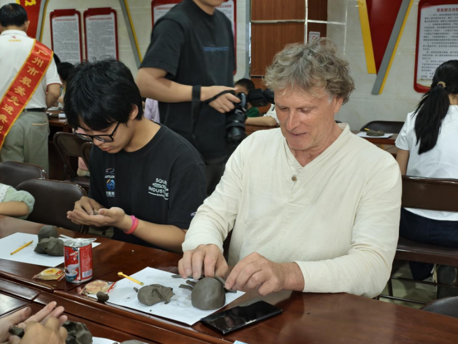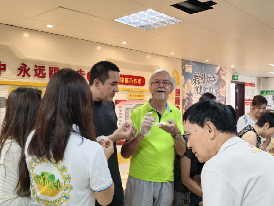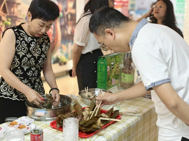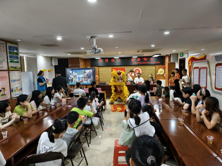 在文化体验环节,亲子家庭分组协作,二楼会议室化身创意工坊。在陶艺师示范指导下,家长与孩子巧手捏塑,将陶土化作神采奕奕的狮头,或塑造成乘风破浪的龙舟。每一件作品都凝结着对传统文化的理解与创造。此外,飘散着粽香的党建厅,中外居民一同品尝粽子、豆浆、冰皮饼等传统美食,中外邻居热切畅谈,分享活动感悟。